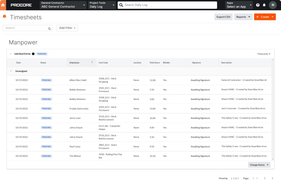 - Real-time integration: SmartBarrel integrates with platforms including Procore, Vista, and CMiC to support downstream payroll, job costing, and reporting workflows.